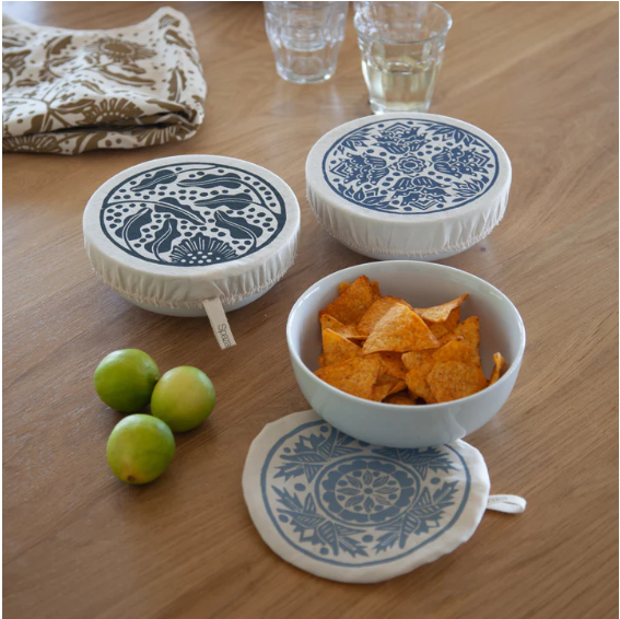 Perfect for covering your prep bowls or cereal bowls. This is our super handy extra small size, from our set of minis sets. Great for leftovers, overnight oats, and fermenting.