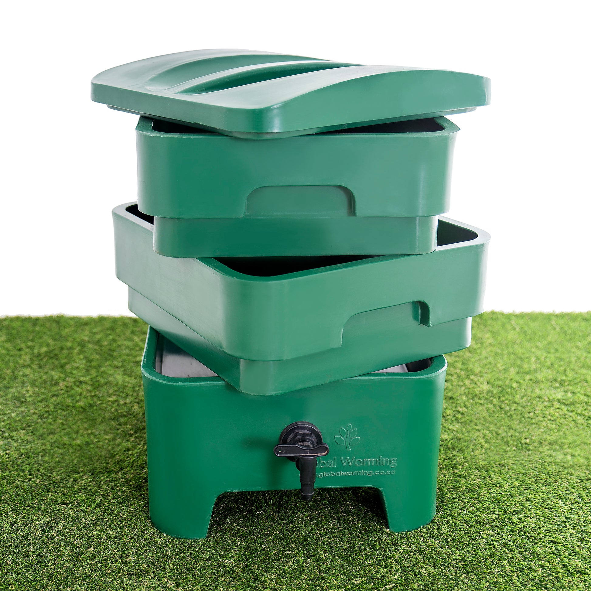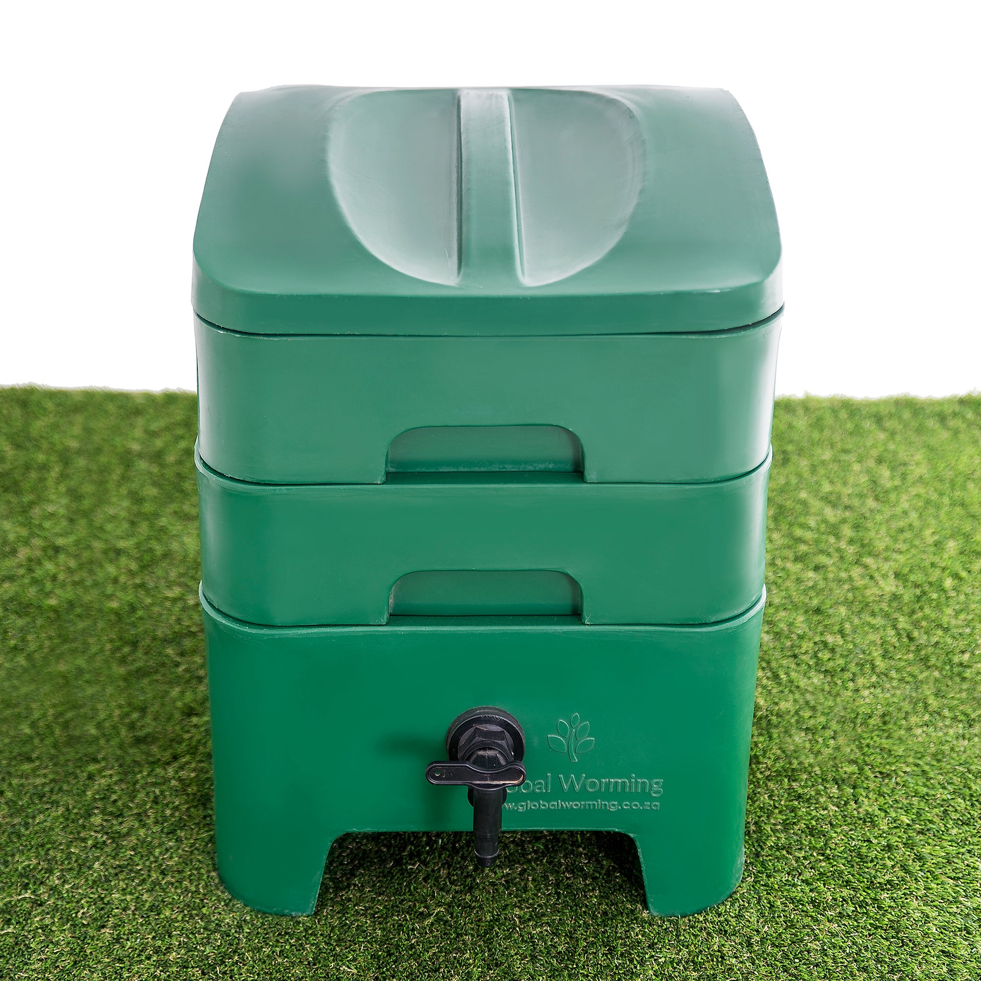 It's no ordinary worm farm. It is UV resistant, strong and durable. It includes two working trays with an additional drainage tray (so it is a 3 tiers farm). There is a built-in tap that collects the worm liquid which can be used on your garden. The unit is sold together with a coco coir block to be used in your worm bedding, a worm blanket, 500 composting worms and the instruction manual.
